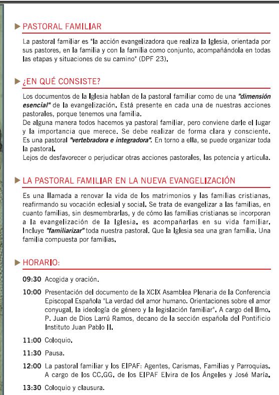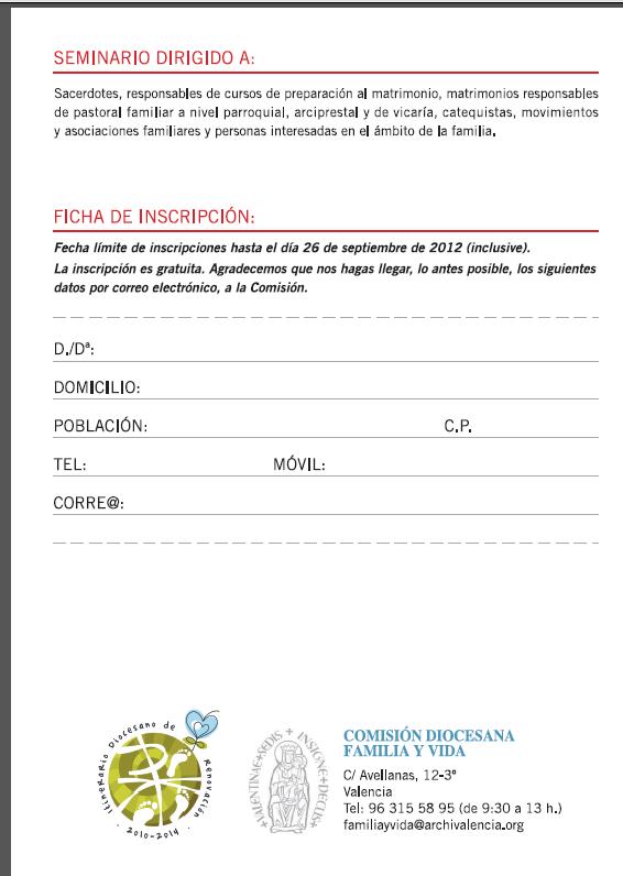 Seminario dirigido a sacerdotes, responsables de cursos de preparación al matrimonio, matrimonios responsables de pastoral familiar a nivel parroquial, arciprestal y de vicaría, catequistas, movimientos y asociaciones familiares y personas interesadas en el ámbito de la familia.